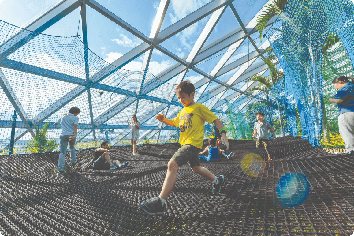 No deje de visitar Jewel Changi Airport, el último complejo de ocio y comercio temático de Changi, que alberga el Rain Vortex, la cascada cubierta más alta del mundo, con 40 metros de altura, y una gran variedad de atracciones lúdicas. Para los jóvenes de edad y de espíritu, recomendamos una visita al Canopy Park (situado en el nivel 5 de Jewel) donde podrán saltar y deslizarse por toboganes gigantes o explorar el mundo virtual del aeropuerto de Changi a través de juegos interactivos en Changi Experience Studio, en el nivel 4. Al caer la noche, disfrute del impresionante espectáculo de luces del Rain Vortex, todo un espectáculo de luz y sonido.