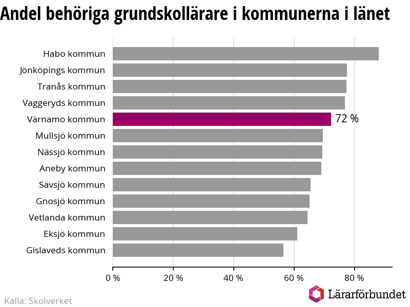 Av de sammanlagt 288 heltidstjänsterna i grundskolan i Värnamo kommun (motsvarande 345 lärare) var det 207 som hade lärarlegitimation och behörighet i minst ett ämne.