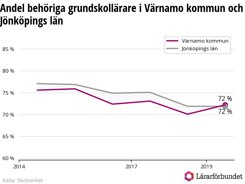 I oktober 2019 hade motsvarande 72 procent av lärarna1 i grundskolan i Värnamo kommun lärarlegitimation och behörighet i minst ett ämne. Det är en ökning med två procentenheter jämfört med året innan.