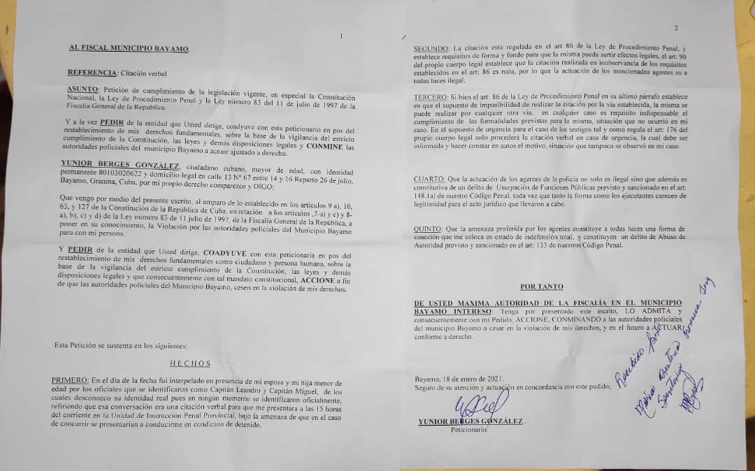 El 18 de enero Yunior Berges y Roberto A. Rodríguez, activistas en el municipio Bayamo, Provincia Granma fueron interpelados en sus viviendas por los oficiales de la Seguridad del Estado que se identificaron como Capitán Leandro y 1er Tte Miguel. Los agentes del estado los citaron verbalmente, exigiéndoles que se presentara ese mismo día a las 15 horas en la Unidad de Instrucción Penal Provincial que se ubica en el municipio, bajo amenaza de detenerlos si no se presentaban en la mencionada unidad.