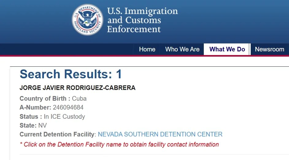 La comparecencia de Rodríguez Cabrera será ante el juez Glen R. Baker en Las Vegas, estado de Nevada. El Localizador de Detenidos de ICE confirma que el cubano permanece bajo custodia en el Nevada Southern Detention Center.