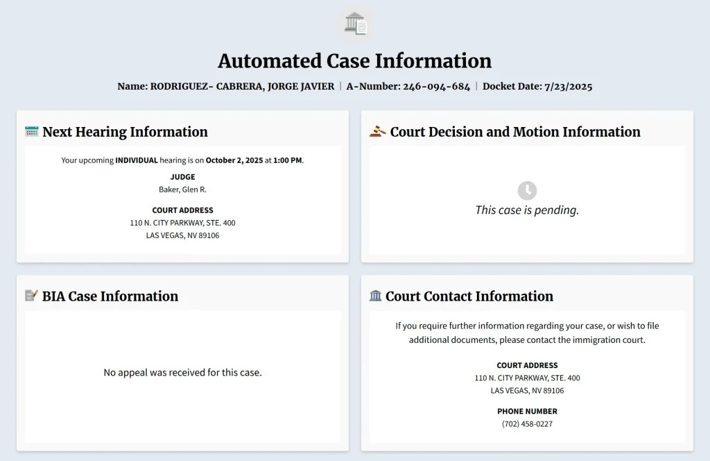 MIAMI, Estados Unidos. – La Corte de Inmigración de Las Vegas programó la audiencia individual del cubano Jorge Javier Rodríguez Cabrera para el próximo 2 de octubre a la 1:00 p.m. (horal local), según el Sistema automatizado de información de casos (EOIR, por sus siglas en inglés) consultado por CubaNet este martes. El expediente continúa “pendiente” y no registra ninguna acción ante la Junta de Apelaciones de Inmigración (BIA, por sus siglas en inglés), de acuerdo con la misma fuente.