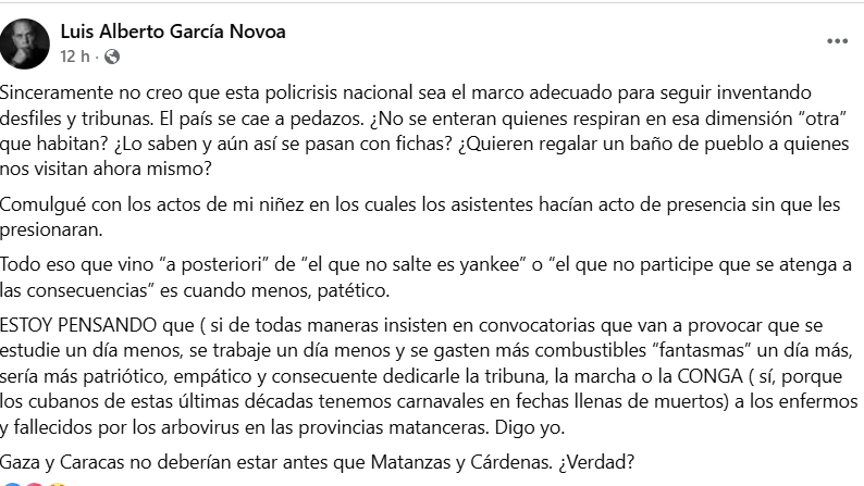 En tono irónico, el reconocido actor propuso un uso más coherente de esos esfuerzos de movilización: “Sería más patriótico, empático y consecuente dedicarle la tribuna, la marcha o la conga a los enfermos y fallecidos por los arbovirus en las provincias matanceras. Digo yo.” Y cerró su reflexión con una pregunta que resonó entre los usuarios: “Gaza y Caracas no deberían estar antes que Matanzas y Cárdenas. ¿Verdad?”