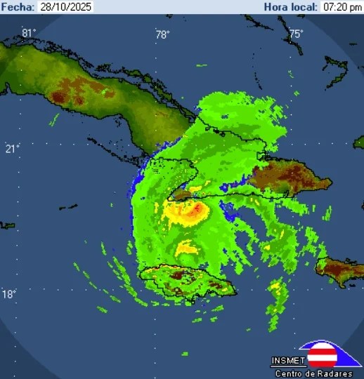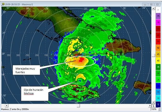 El Dr.Rubiera situó el centro del sistema a 245 kilómetros al suroeste de la capital jamaicana y a 350 kilómetros al sur de Cabo Cruz (Granma). Explicó que las bandas de lluvias ya alcanzan Camagüey y la región más oriental de la Isla, con extensos núcleos convectivos también sobre Haití y República Dominicana. El ojo —muy bien definido, explicó el Dr.— tiene entre 16 y 18 kilómetros de diámetro, indicador de la intensidad del sistema. “Son fenómenos muy peligrosos los que hay ahí”, subrayó, al mostrar imágenes y estimaciones de topes nubosos asociados a precipitaciones intensas y persistentes.