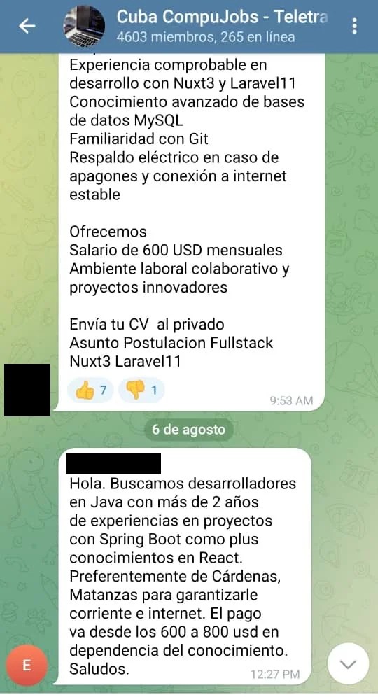 Tanto en Telegram como en plataformas de internet se hallan disponibles ofertas laborales para estos profesionales que suelen demandar determinada experiencia previa, un currículo bien diseñado y muchas veces disponibilidad para una contratación a tiempo completo. En el grupo CubaCompuJobs integrado por más de 4.000 miembros se han registrado en el último mes propuestas de este tipo procedentes de empresas radicadas en América Latina, Estados Unidos y Europa.