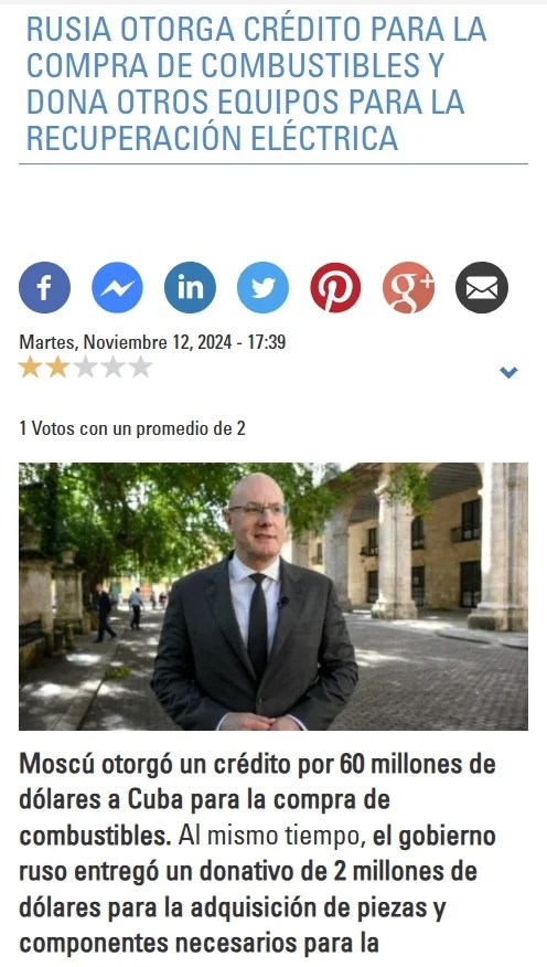 (En noviembre de 2024, tras el paso del huracán Rafael, Moscú concedió un crédito de 60 millones de dólares al Gobierno cubano para la compra de combustibles. La noticia fue confirmada en enero de este año por la prensa oficial cubana).