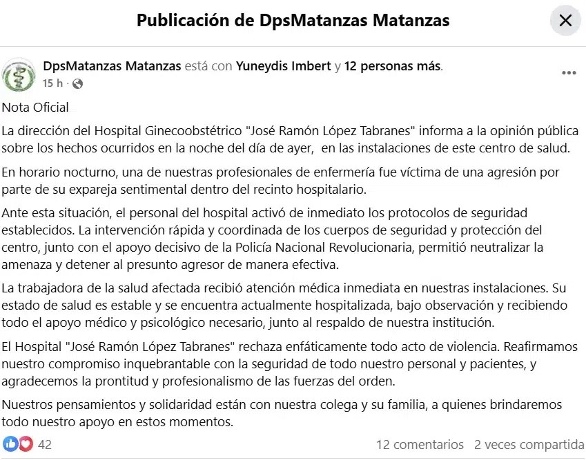 MIAMI, Estados Unidos. – La Dirección Provincial de Salud de Matanzas informó este miércoles que una enfermera del Hospital Ginecobstétrico “José Ramón López Tabranes” había sido agredida por su “expareja sentimental” dentro del centro asistencial en horas de la noche del martes.