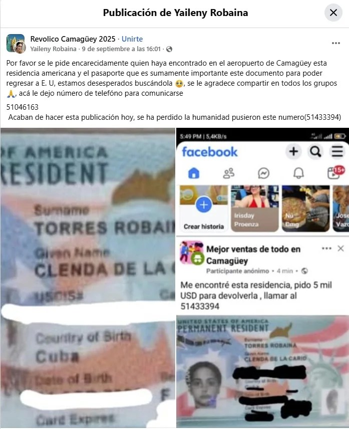 La primera alerta pública se difundió en Facebook, cuando la usuaria identificada como Yaileny Robaina pidió ayuda en el grupo de Facebook Revolico Camagüey 2025 para localizar los documentos extraviados.