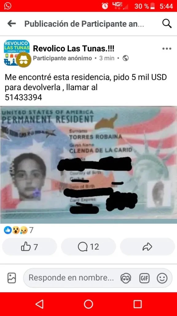 Poco después, circularon en otros grupos de compraventa capturas de pantalla con la foto de la green card y la solicitud de dinero para devolverla. Uno de los comentarios en la publicación de Yaileny Robaina, a nombre de Yarelys Roselló Pérez, reza: “Mira esta barbaridad que encontré ahora”. También incluye la captura de pantalla de la publicación de un participante anónimo en el grupo de Facebook Revolico Las Tunas.!!! en la que se exigen 5.000 dólares para devolver la residencia y se ofrece un número de contacto.