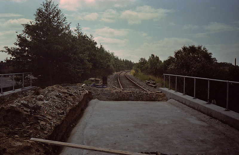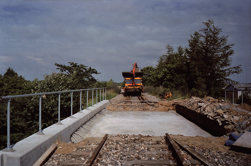 I østenden af Ejstrupholm station passerer banen på en bro over Østergade. Billedet her er optaget fra øst mod vest, altså set ind mod Ejstrupholm. Til venstre for det viste spor lå sporet for privatbanen Rask Mølle-Ejstrupholm. Ca. 1985. Fotograf: Thomas D. Rithmester. Tak til Thomas for at billedet må vises her. Som ovenfor men set i modsat retning, altså set mod Funder. Bemærk at troljen således er "spærret inde" på banestykket mellem Ejstrupholm og Hjøllund. Ca. 1985. Fotograf: Thomas D. Rithmester. Tak til Thomas for at billedet må vises her.